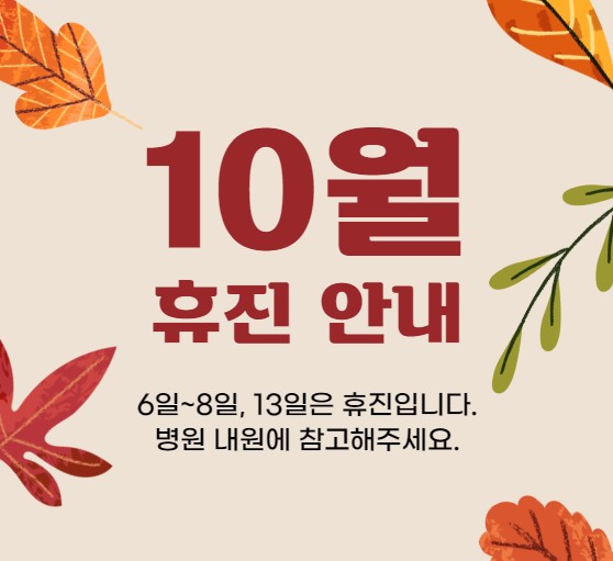 Áö¿À¼ºÇü¿Ü°ú 2025³â 10¿ù Áø·á ÀÏÁ¤ ¾È³»ÀÔ´Ï´Ù.2025³â 10¿ù¿¡´Â Ãß¼®¿¬ÈÞÀÎ 6ÀÏ~8ÀϱîÁö ÈÞÁøÀ̸ç, 13Àϰú 16ÀÏ, 23ÀÏ 30ÀÏ ¸ñ¿äÀÏ¿¡ Áø·á¸¦ ÇÏÁö ¾Ê½À´Ï´Ù. ´Ü, 10¿ù 9ÀÏ Çѱ۳¯¿¡´Â Áø..